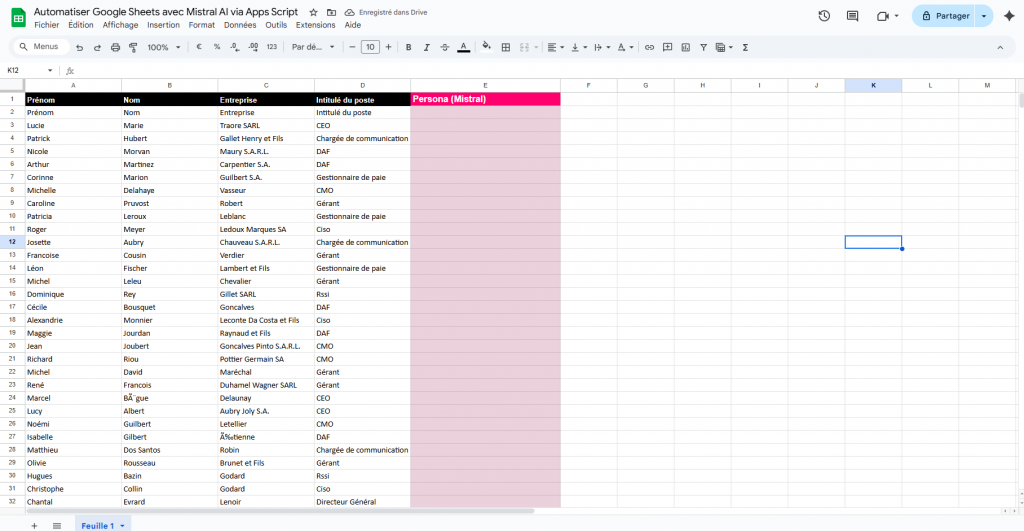 =MistralAI(CONCATENER("Quel est le service métier associé à ce poste :";D2;" Réponds uniquement par un seul mot parmi : marketing, commercial, direction, finances, communication, informatique, ressources humaines. Aucun commentaire, aucune explication, aucune phrase. Réponds uniquement par un seul mot."))- Autorisez l’exécution du script lors de la première utilisation (pop-up Google)