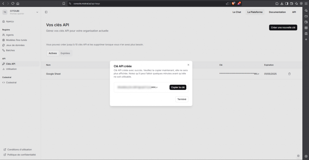 Créer un compte Mistral AI et récupérer sa clé API