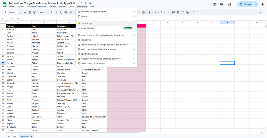 🎯 Objectif du jour : créer une fonction IA dans Google Sheets, alimentée par Mistral, comme vous le feriez avec une fonction Excel.