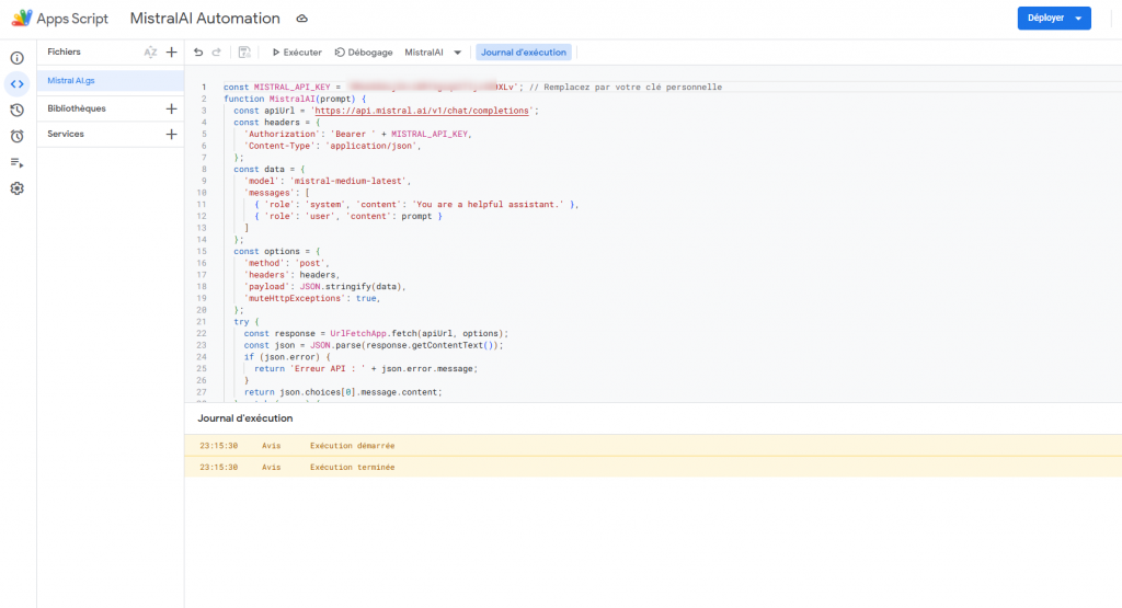Connecter Mistral AI à Google Sheets avec Apps Script